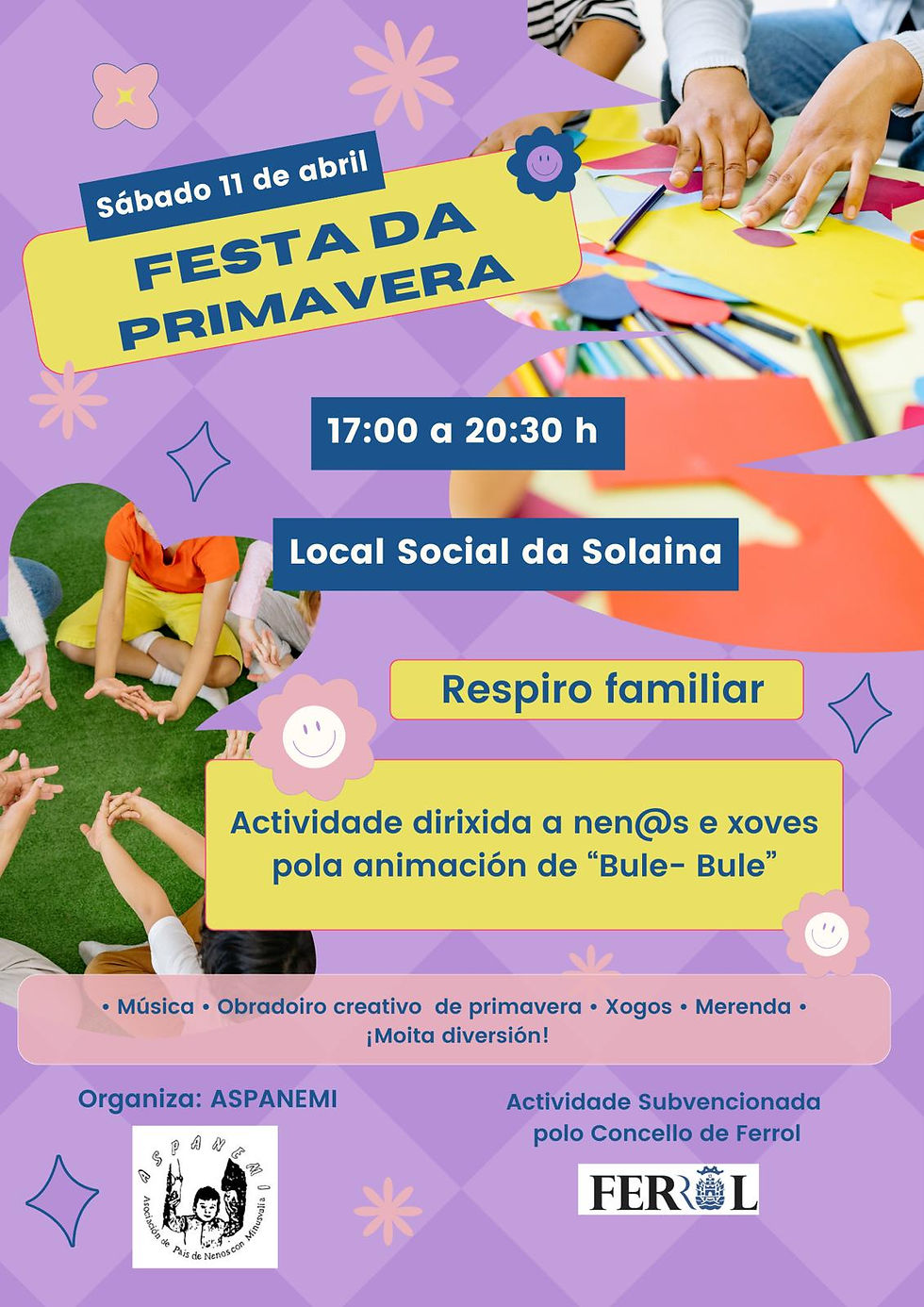 Dentro dos Respiros Familiares o vindeiro 11 de abril celebraremos en ASPANEMI a Festa da Primavera. Xogos, obradoiro de manualidades e música para recibir á nova estación.